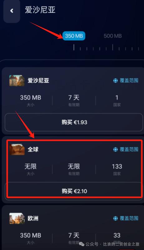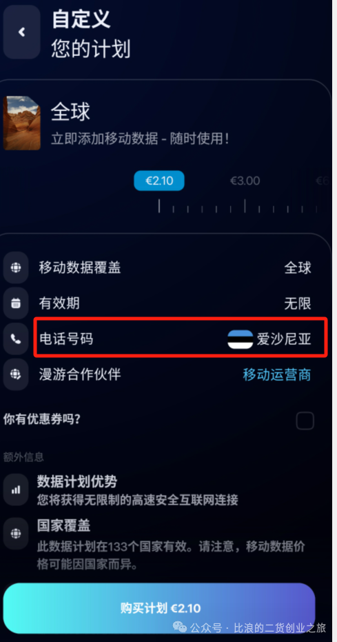 我们把顶部的数据流量滑动到最低的350M,然后选择“全球”这一块儿内容,可以看到只需要2.1欧元,大概折合人民币17块钱,有效期无限,重点是会给一个爱沙尼亚的eSIM手机号。