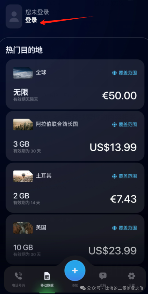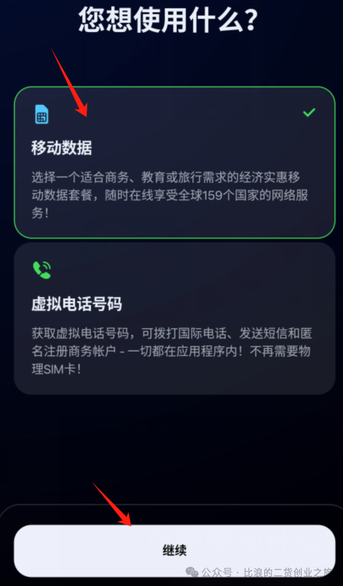 安装完打开软件,我们选择想使用“移动数据”,因为有个移动数据购买是送爱沙尼亚eSIM手机号的,而那个“虚拟电话号码”实际上是一种租用它们平台的海外手机号的方式,比较贵,最便宜的也要7美金一个月,所以这里点击“移动数据”。
