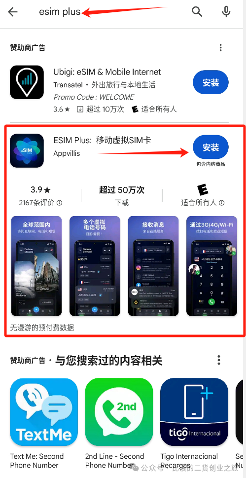 我们先在手机谷歌应用商店(没有安装谷歌三件套的可以谷歌搜索平替软件商店apkpure,在apkpure应用商店搜索下载)或者苹果应用商店(搜不到的话可以搞个美国苹果ID《2分钟简单无门槛注册苹果美版/港版Apple ID教程2024年全新,可玩性更强》)搜索“esim plus”,并下载安装。