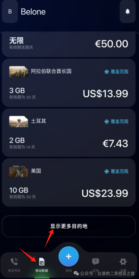 “移动数据”页面拉到最底部,点击“显示更多目的地”。