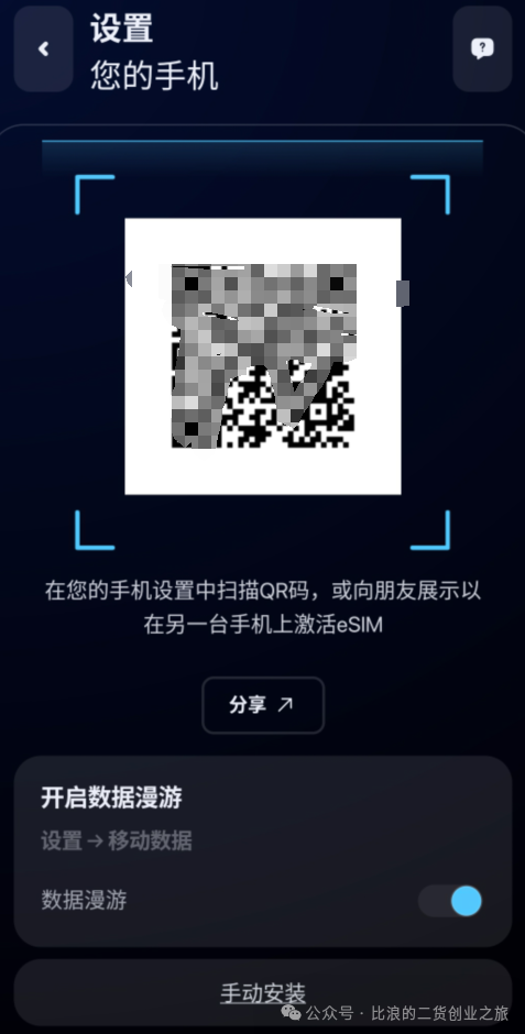 支付后直接就给我们展示eSIM的二维码了,如下图所示,我们直接用支持eSIM的海外版手机扫码,或者国内的手机配合5ber小工具(详细介绍看这篇文章《超低门槛让手机支持eSIM卡,可放15张海外电话卡,出海必备小工具5ber》),也能拥有eSIM功能,扫码下载并启动就可以正常使用了。