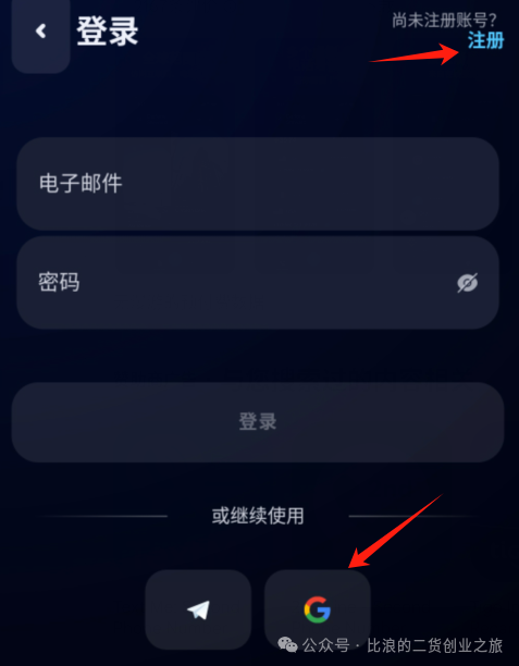 我们可以点击右上角注册按钮去填写注册信息注册,也可以快捷一点,直接点击下图底部箭头所示的谷歌账号一键注册登录,方便太多。