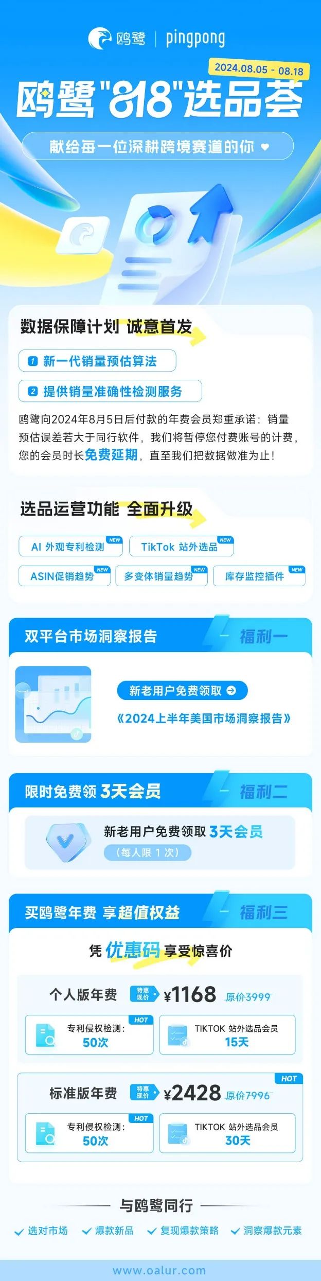鸥鹭在8月5日到8月18日做活动,除了新老用户都可以免费领3天会员,原价3999元年费个人套餐,现在只需要1168元,相当于每月不到100块钱,还是挺划算的,关键是如果销量预估误差大于同行软件,可以免费用。